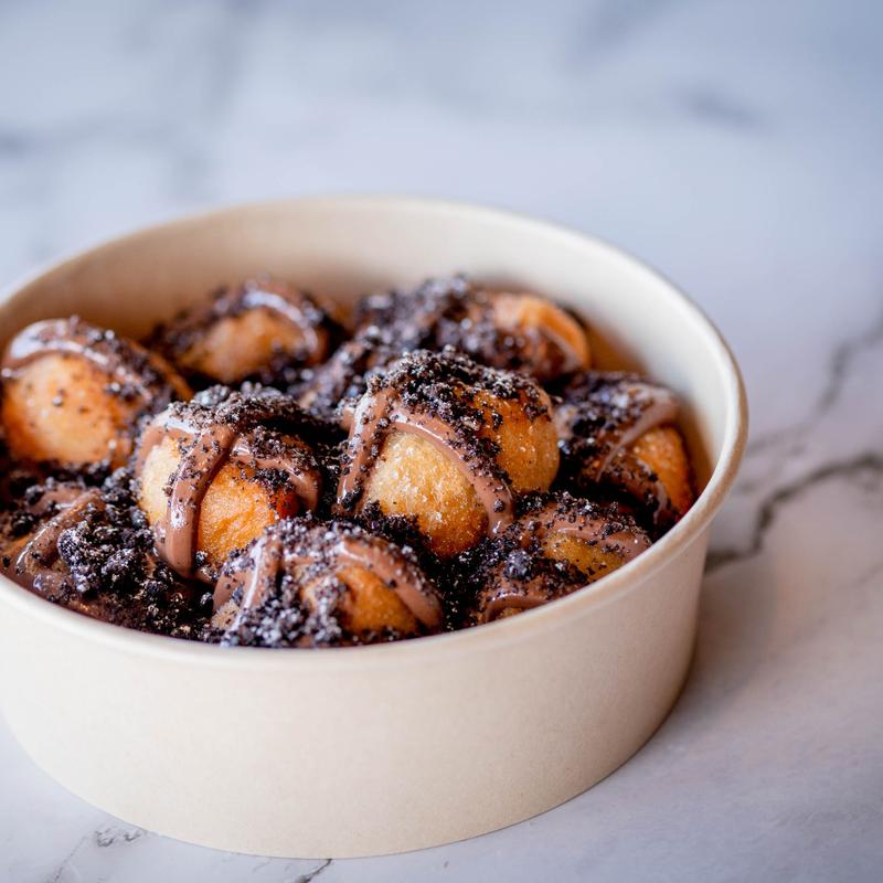 Greek Fried Donut Holes with Hazelnut Praline, Powdered Sugar & Crushed Cookies